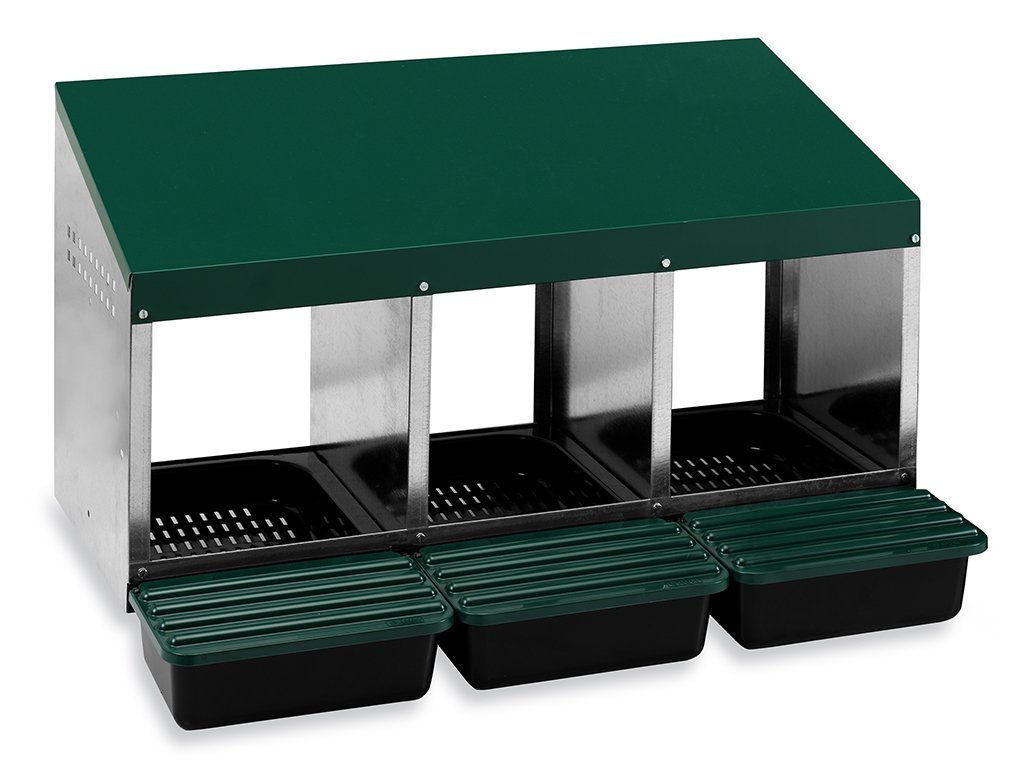 Znáškovej hniezdo pre sliepky so zberným košíkom na vajcia trojmiestne, kapacita až pre 15 nosníc (5 nosníc na jednu kukaň), dno hniezda je spádované, vajcia sa samo odkotúľa do zberného koša, vyrobené z pozinkovaného kovu s plastovým dnom, farba zelená. Hniezdo môžete jednoducho postaviť v kurníku na zem alebo zavesiť na stenu, veľmi ľahká údržba čistoty, rozmery: 48 cm délka x 79,7 cm šířka x 52 cm výška.